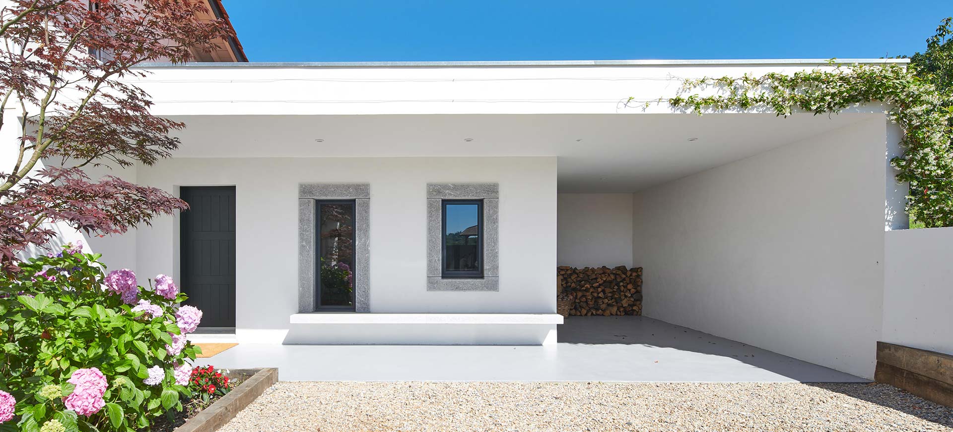 des fenêtres et le banc suspendu en pierre de taille redessinent avec légèreté