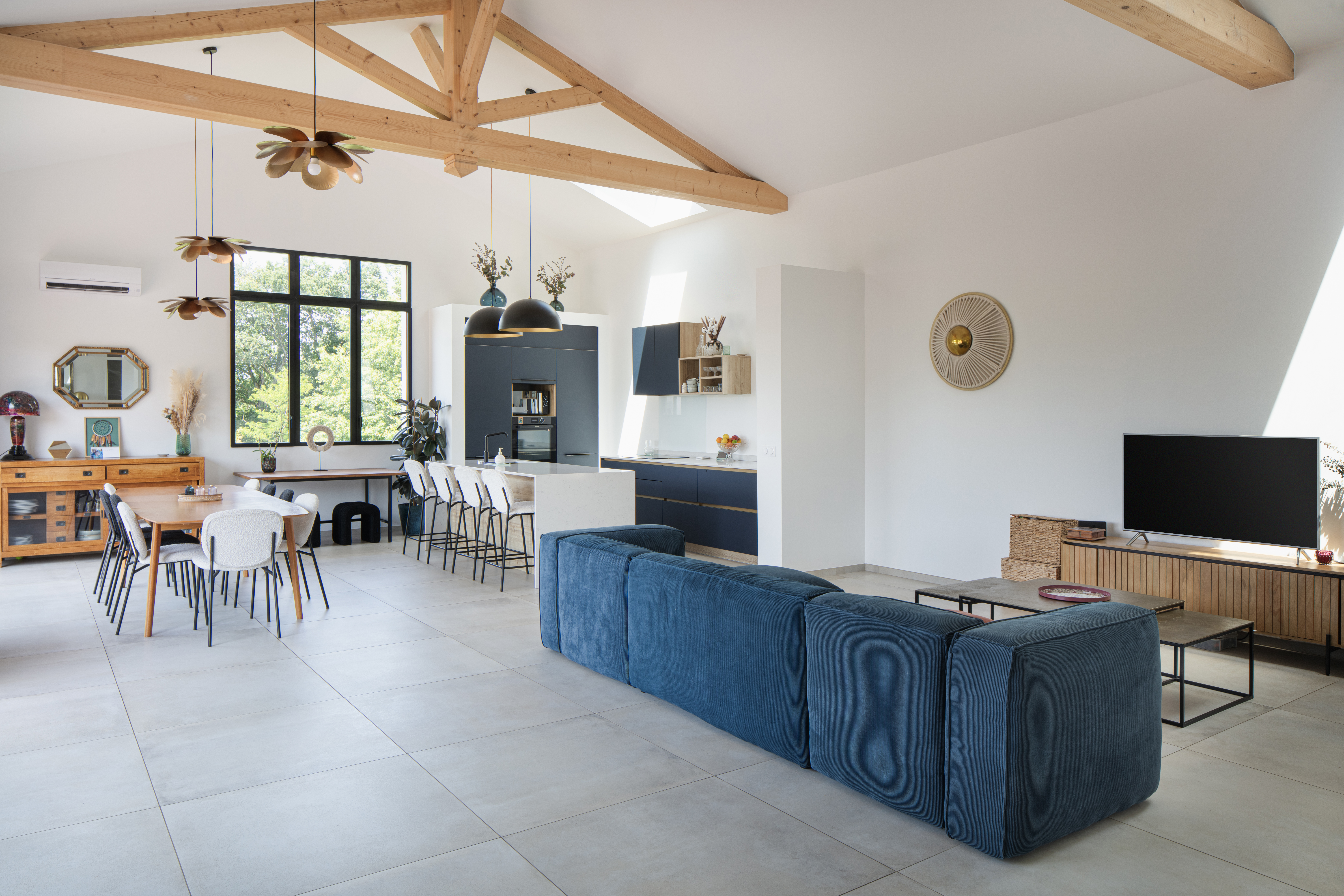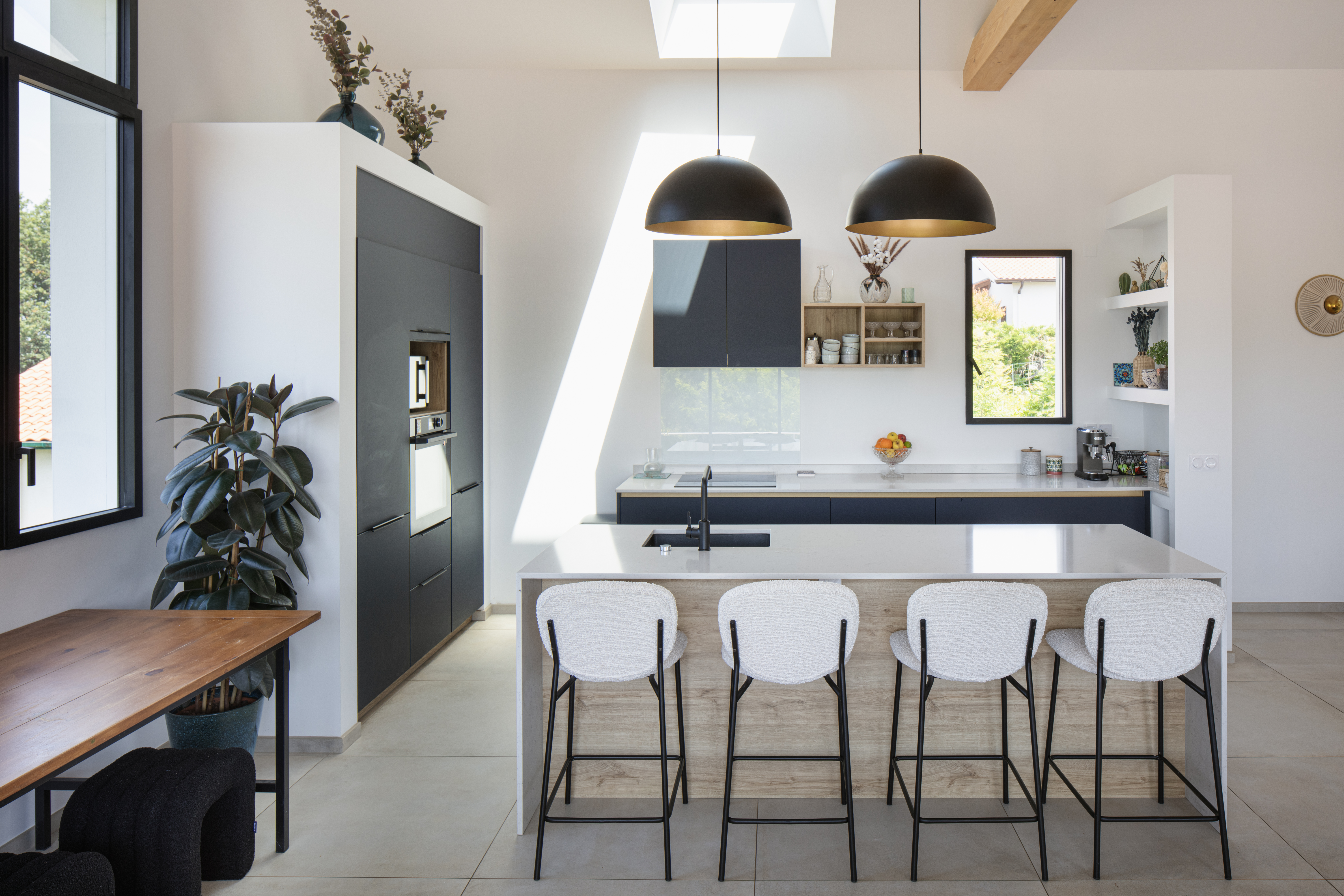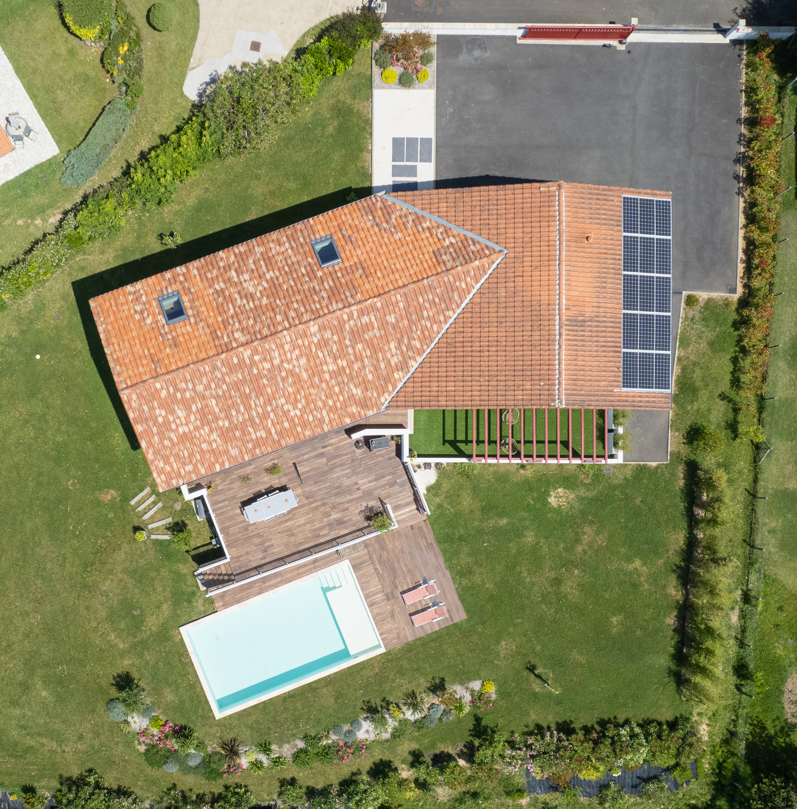 Cette maison domine la campagne de Saint-Pierre-d’Irube avec une vue lointaine sur Bayonne, cadre idéal pour une vie de famille. Le couple, avec deux enfants, m’a consulté dès l’achat de cette maison au fort potentiel mais nécessitant une lourde rénovation. Une extension de 70 m², perpendiculaire au faîtage, crée une ligne brisée cadrant le paysage. Elle accueille l’entrée et les espaces de jour, séparant la partie nuit rénovée. Salon et cuisine, avec hauteur sous plafond et charpente apparente, s’ouvrent sur la forêt et la piscine.