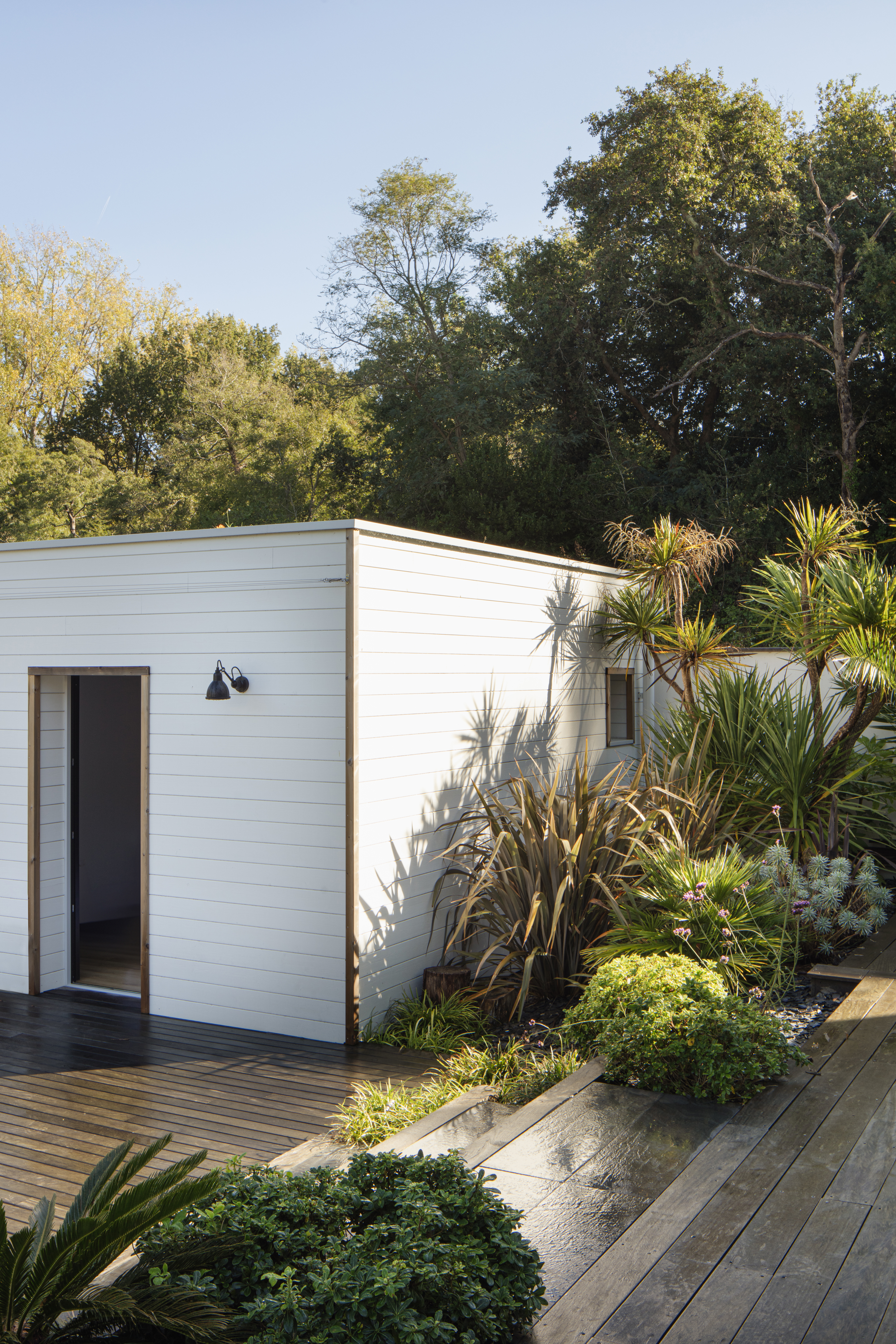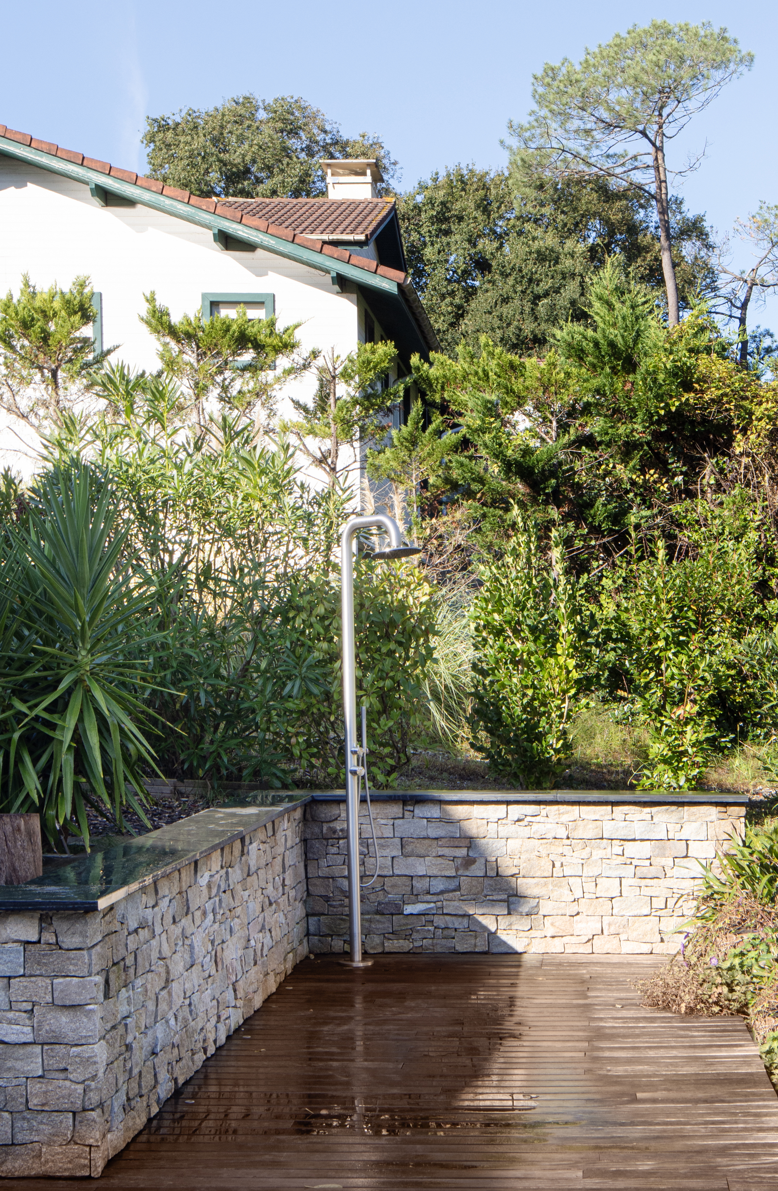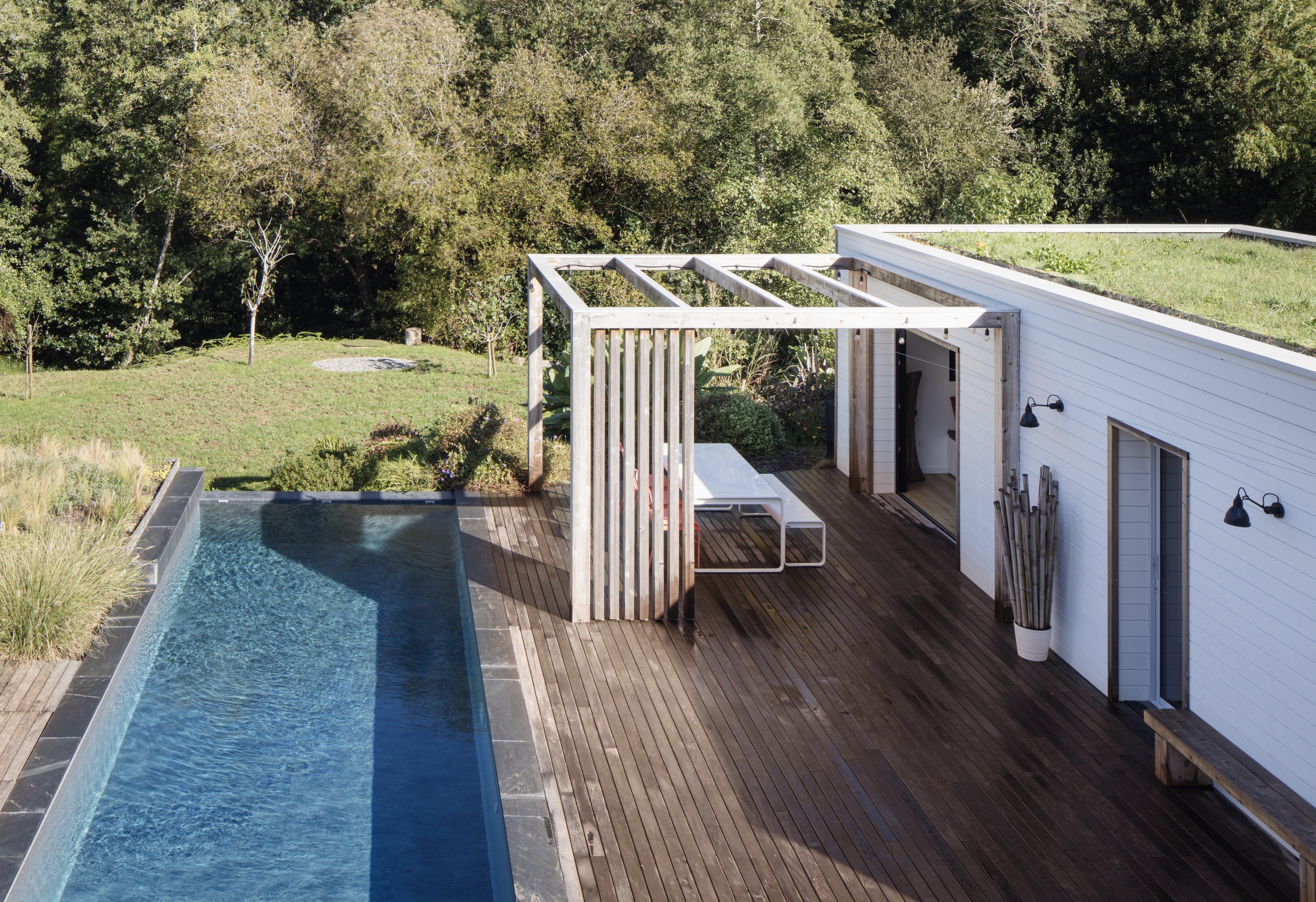 Cette villa disposait d’un vaste jardin en pente, peu valorisé, pourtant ouvert sur la forêt du lac Mouriscot. Le projet vise à reconnecter pleinement la maison à son extérieur. Une extension en ossature bois au toit végétalisé, une piscine, un jacuzzi et de larges terrasses créent une véritable pièce de vie extérieure. L’implantation s’intègre au paysage : la piscine invite à contempler la forêt et donne, en nageant, la sensation de flotter vers les cimes. L’ensemble forme une clairière paisible, à deux pas de l’océan.